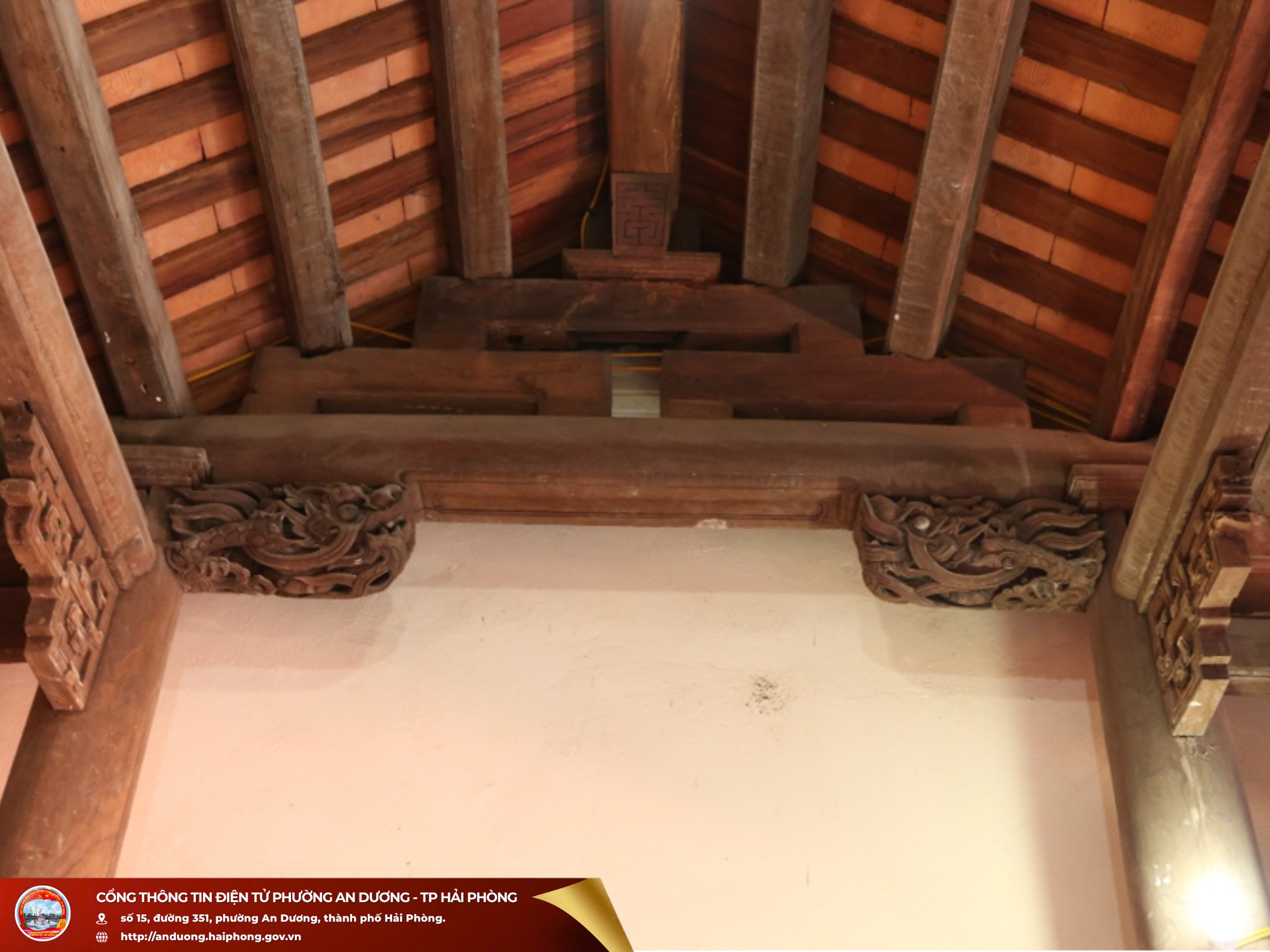 - Câu đối 2: Câu đối kiểu lòng máng làm bằng gỗ tốt, treo trước cột cái cửa cung cấm. Diềm câu đối chạm hoa văn hoa dây, điểm xuyết có các mảng gấm, trên đầu và dưới chân câu đối chạm ô tròn trong ô chạm theo thức truyền thống, thượng cầm, (chim phượng), hạ thú (lân trong mây). Nền câu đối chạm nền gấm, chạm câu đối chữ Hán sơn then.