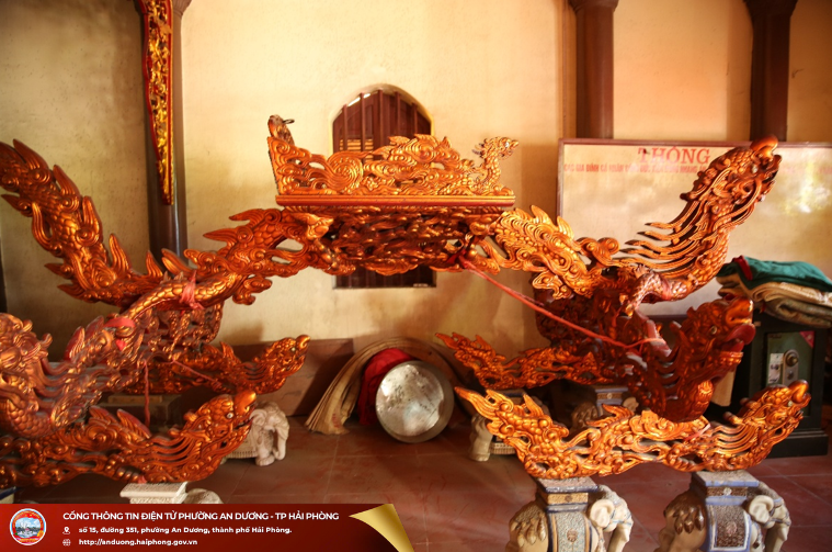Kiệu thất cống- Kiệu bát cống và kiệu thất cống, hai bộ kiệu làm bằng gỗ vàng tâm, loại gỗ nhẹ để khiêng trong lễ rước thánh được thuận tiện, dễ dàng. Kiệu bát cống và thất cống đều do tám người khiêng rước. Kiệu bát cống là kiệu biểu tượng để rước Đức thánh ông, kiệu thất cống biểu tượng rước Đức thánh bà (Đức thánh bà ở đây là thân mẫu của Nguyễn Hồng). Kiệu bát cống gồm đủ bộ có cả phần long ngai hậu bành ở trên. Kiệu cấu tạo 8 thanh rồng, các thanh rồng được lắp gép chồng lên nhau qua bốn chốt sắt và bánh trè. Phần long ngai cũng được lắp gép với hệ thống thanh rồng qua những mộng thẳng. Cách cấu tạo này giúp cho việc tháo lắp thuận tiện và khi rước thánh kiệu có thể chuyển hướng dễ dàng. Các thanh rồng cũng như hậu bành được chạm khắc đề tài rồng, mây, tứ linh, hoa lá thiêng rất cầu kỳ, tinh xảo.