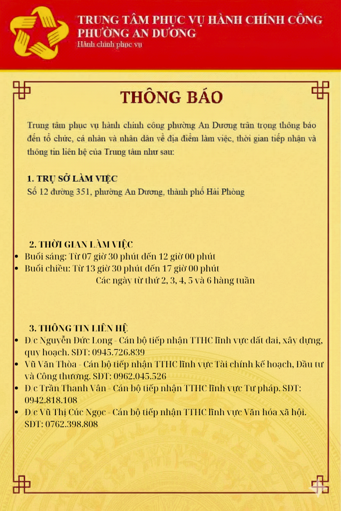 Thông báo Trụ sở làm việc, Thời gian làm việc, Thông tin liên hệ của Trung tâm Phục vụ hành chính công phường An Dương