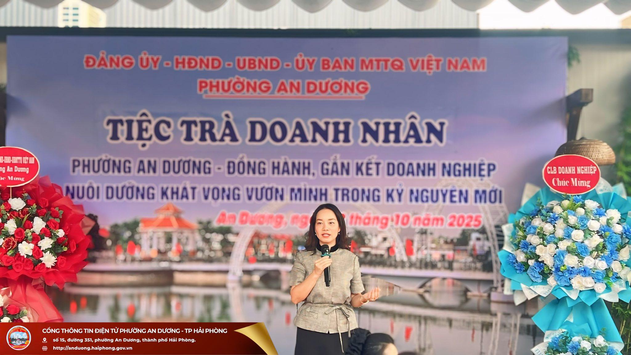 Phát biểu tại chương trình, đồng chí Trần Thị Quỳnh Trang ghi nhận và biểu dương những đóng góp quan trọng của đội ngũ doanh nhân, doanh nghiệp phường An Dương đối với sự phát triển kinh tế - xã hội địa phương. Đồng chí nhấn mạnh: “Trong bối cảnh hội nhập và chuyển đổi mạnh mẽ, doanh nhân chính là lực lượng tiên phong, đóng vai trò quan trọng trong thúc đẩy tăng trưởng kinh tế, đổi mới sáng tạo và xây dựng thương hiệu địa phương. Đảng ủy, chính quyền phường An Dương luôn trân trọng, lắng nghe và đồng hành cùng doanh nghiệp, cùng nhau xây dựng một môi trường đầu tư thông thoáng, minh bạch, hiệu quả - nơi doanh nghiệp phát triển cũng là nơi quê hương An Dương phát triển.”