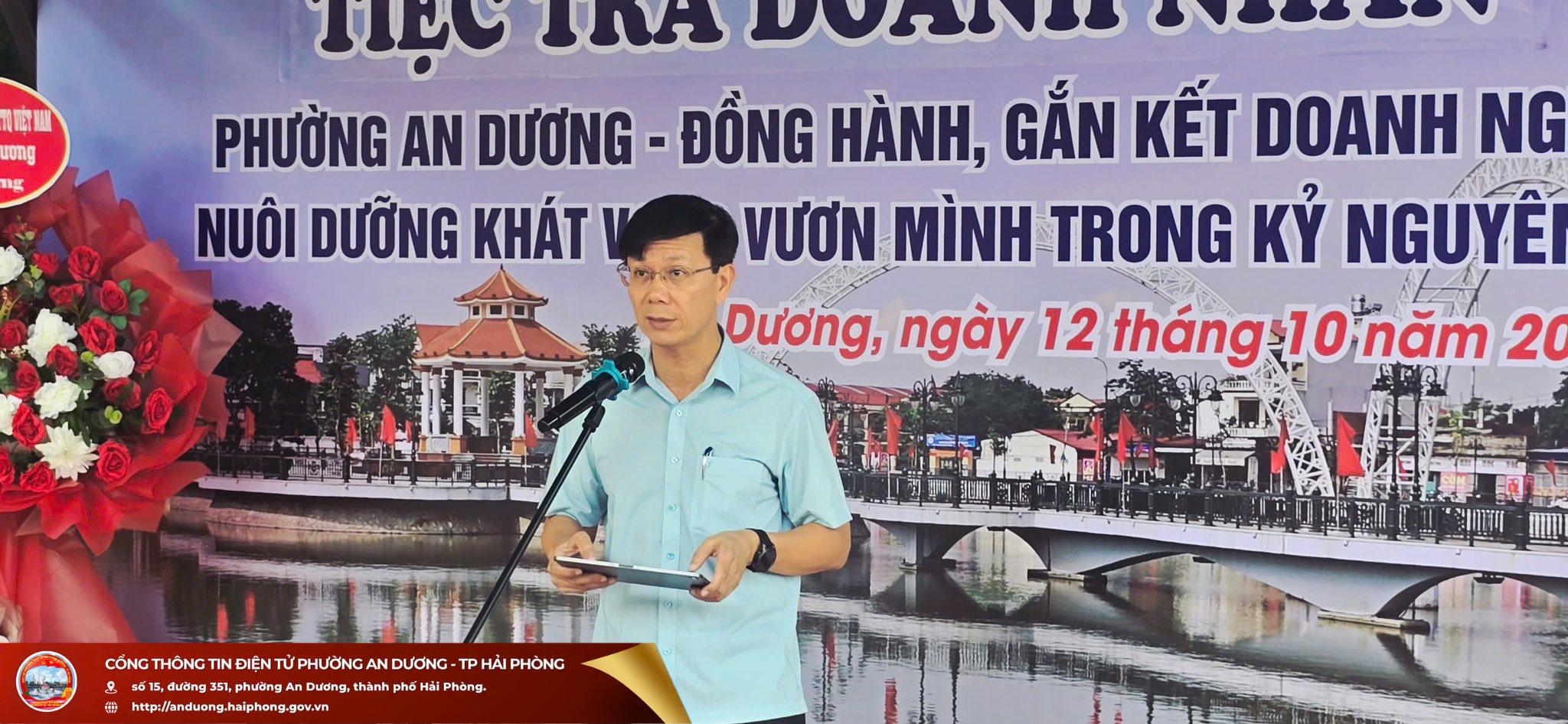 Tiếp đó, đồng chí Bùi Tiến Phong, Phó Bí thư Đảng ủy, Chủ tịch UBND phường phát biểu khẳng định: “Tiệc Trà Doanh nhân là dịp để chính quyền và doanh nghiệp cùng gặp gỡ, lắng nghe, chia sẻ, tăng cường sự gắn kết và đồng hành vì mục tiêu phát triển bền vững.” Đồng chí cũng nhấn mạnh phương châm hành động: “Doanh nghiệp là trung tâm - Doanh nhân là động lực - Chính quyền là người đồng hành tin cậy.” Hiện trên địa bàn phường có hơn 1.000 doanh nghiệp, 17 hợp tác xã và trên 3.200 hộ kinh doanh đang hoạt động hiệu quả, góp phần quan trọng vào tăng trưởng kinh tế, tạo việc làm và bảo đảm an sinh xã hội. Đội ngũ doanh nhân phường An Dương ngày càng thể hiện rõ bản lĩnh, trí tuệ và tinh thần đổi mới sáng tạo, khẳng định vai trò tiên phong trong quá trình chuyển đổi số, phát triển kinh tế xanh và xây dựng chính quyền đô thị hiện đại.