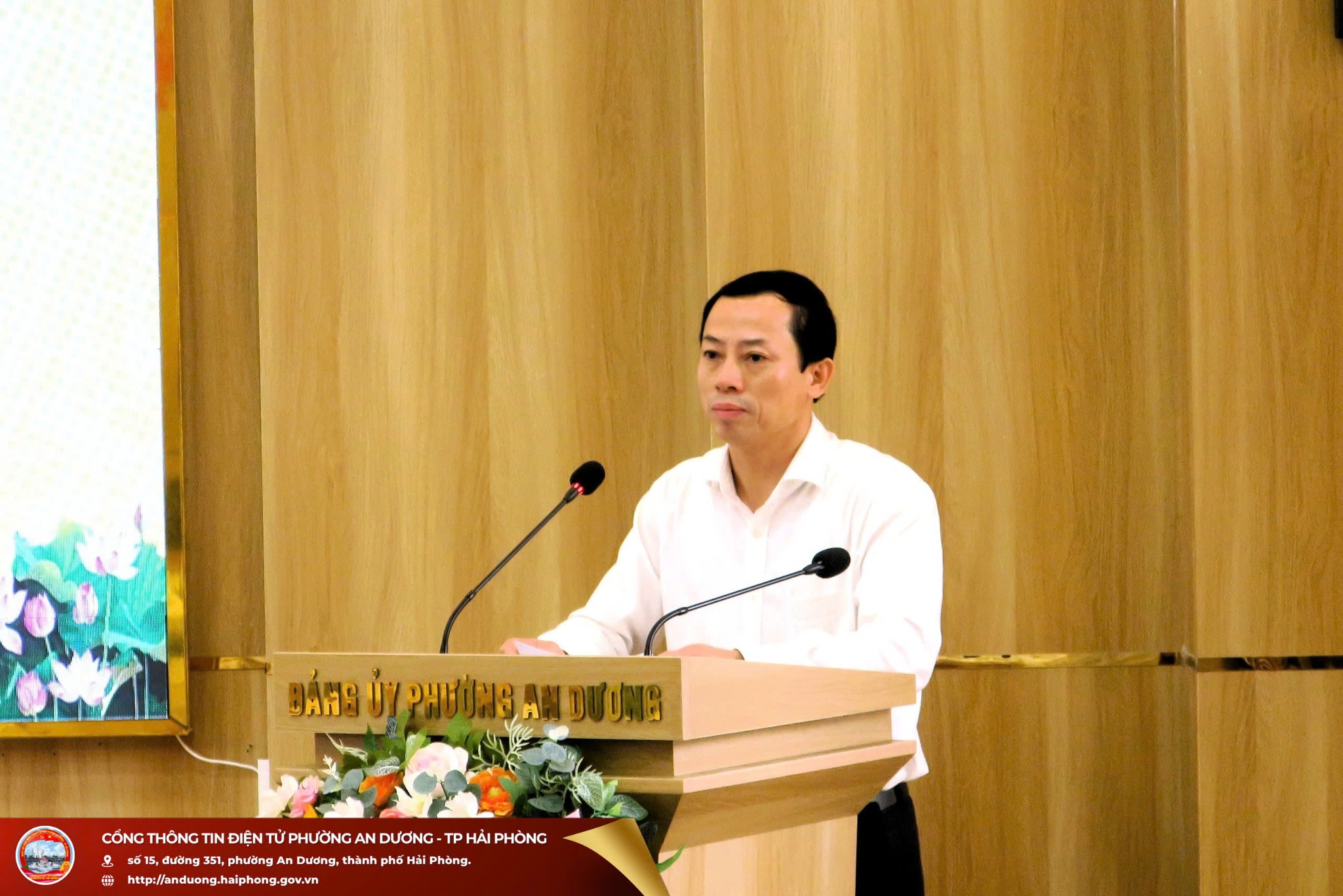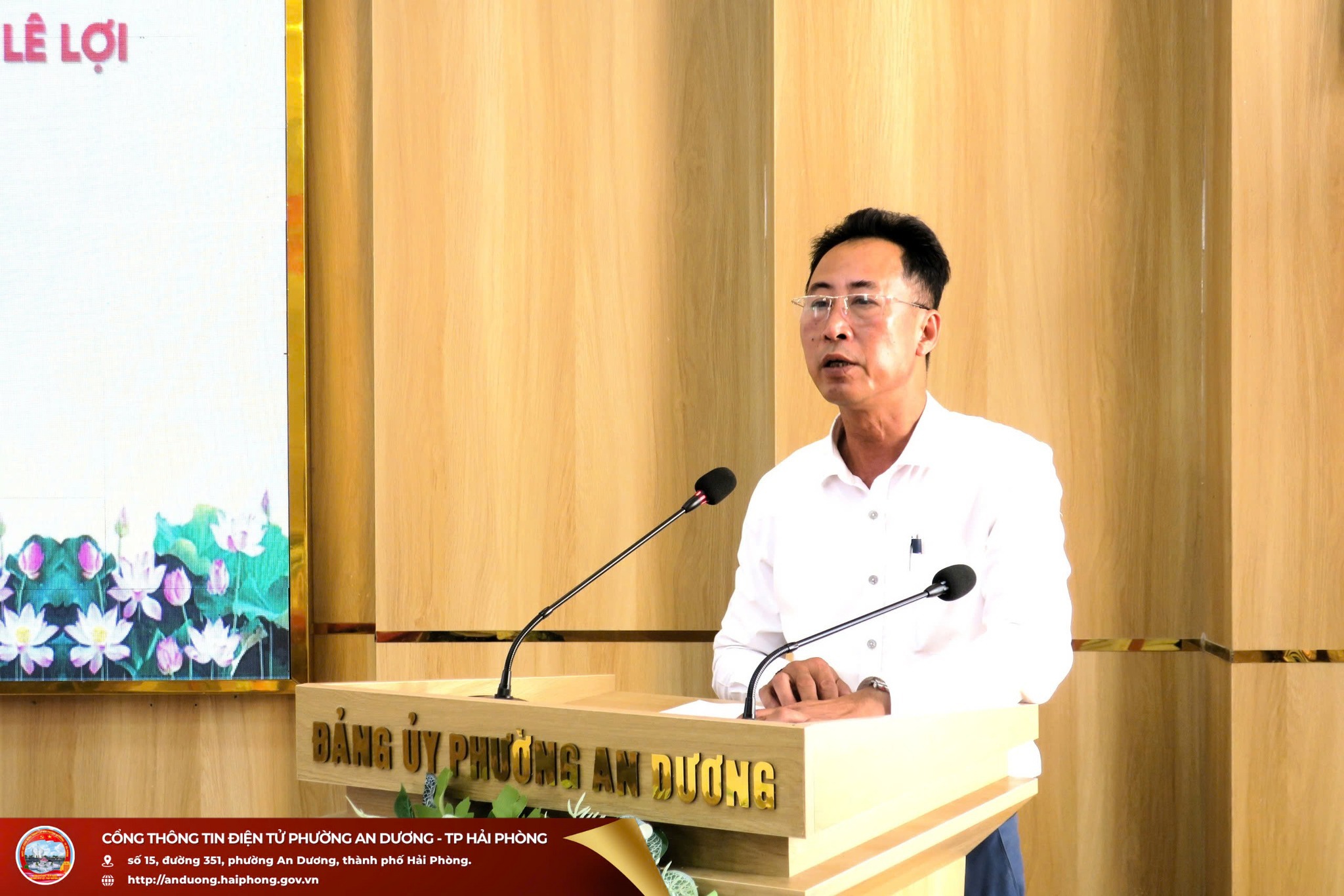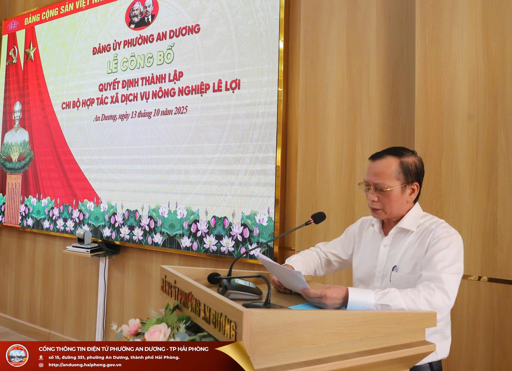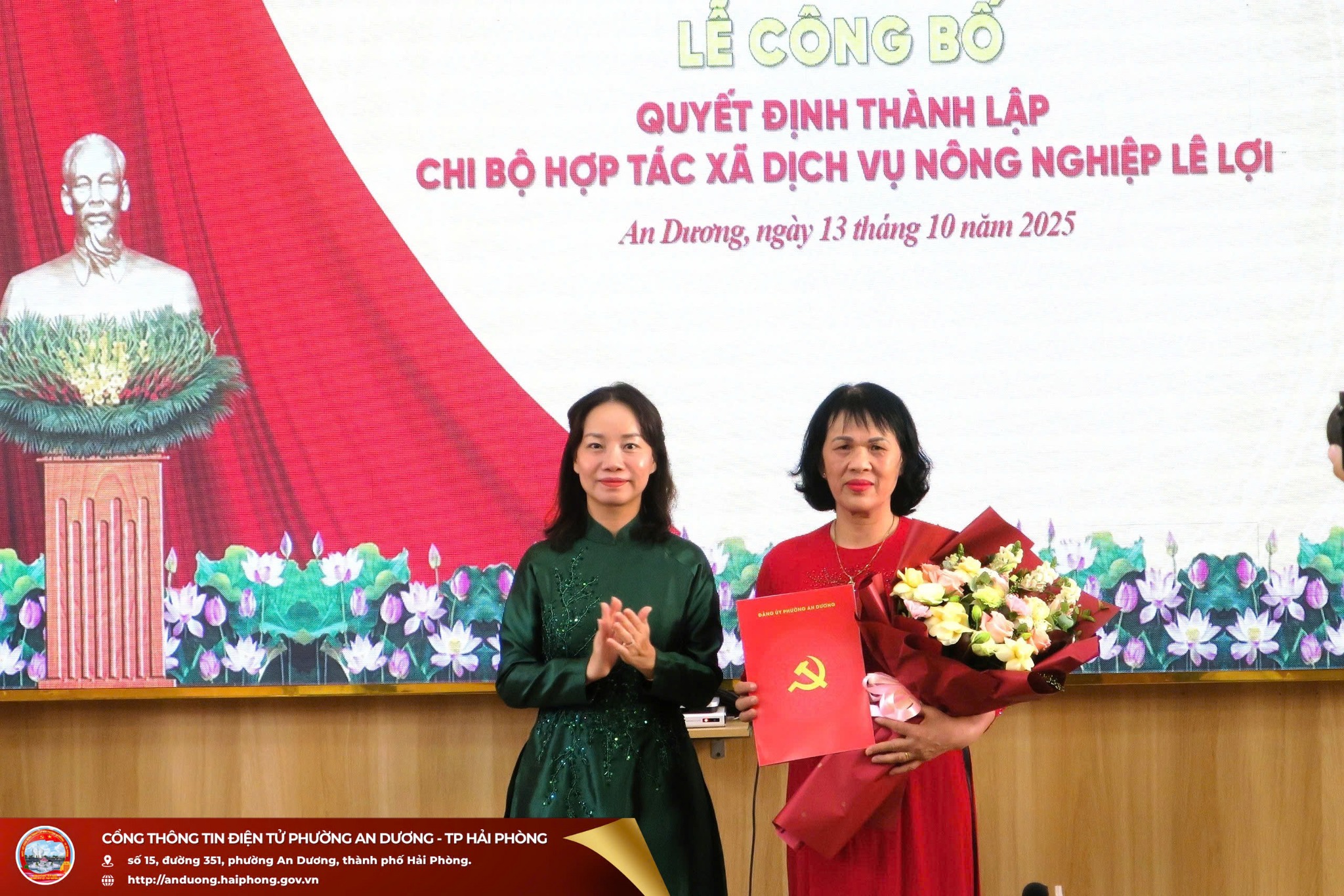 Chiều 13/10, Đảng ủy phường An Dương tổ chức Lễ công bố Quyết định thành lập Chi bộ Hợp tác xã Dịch vụ Nông nghiệp Lê Lợi. Đồng chí Trần Thị Quỳnh Trang, Ủy viên Thành ủy, Bí thư Đảng ủy, Chủ tịch HĐND phường chủ trì; cùng dự có các đồng chí Vũ Đức Thụy, Phó Bí thư Thường trực Đảng ủy và Nguyễn Văn Phong, Ủy viên Ban Thường vụ, Phó Chủ tịch HĐND phường.