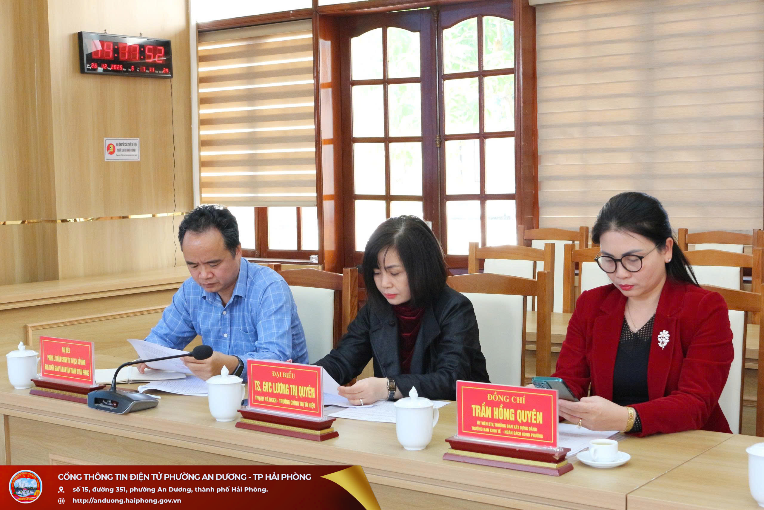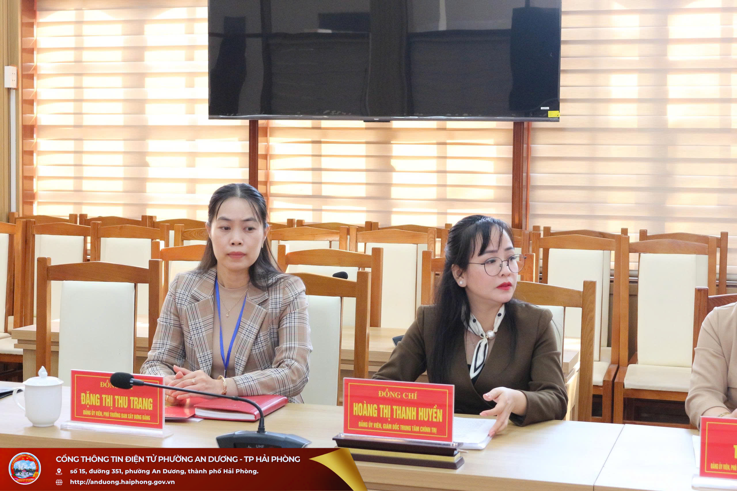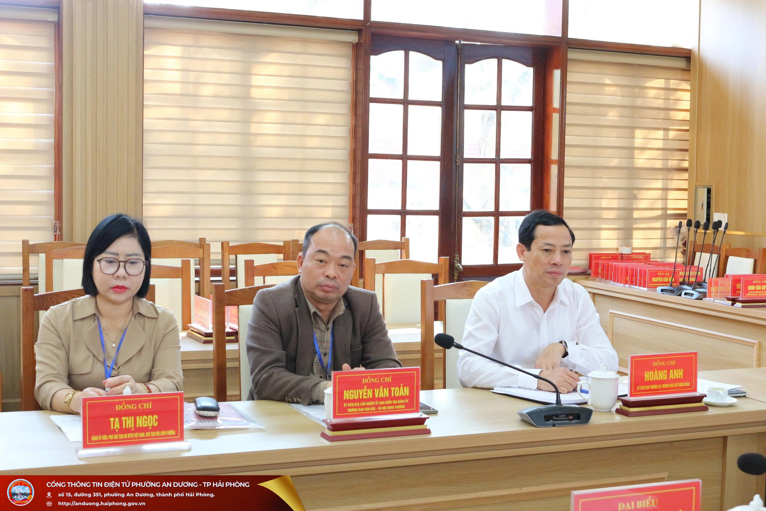 Quang cảnh hội nghịDự hội nghị có đại biểu Phòng Lý luận chính trị và Lịch sử Đảng - Ban Tuyên giáo và Dân vận Thành ủy Hải Phòng; đồng chí Lương Thị Quyên, Tiến sĩ, Giảng viên chính, Trưởng phòng Quản lý đào tạo và Nghiên cứu khoa học, Trường Chính trị Tô Hiệu; đồng chí Phạm Thị Kim Anh, Tiến sĩ, Giảng viên chính, Phó Trưởng phòng Quản lý đào tạo và Nghiên cứu khoa học, Trường Chính trị Tô Hiệu; lãnh đạo Ban Xây dựng Đảng, Ủy ban Kiểm tra Đảng ủy các phường An Dương, An Hải, An Phong; đại diện các cơ quan chuyên trách tham mưu, giúp việc Đảng ủy phường An Dương; cùng đội ngũ viên chức Trung tâm Chính trị phường An Dương.