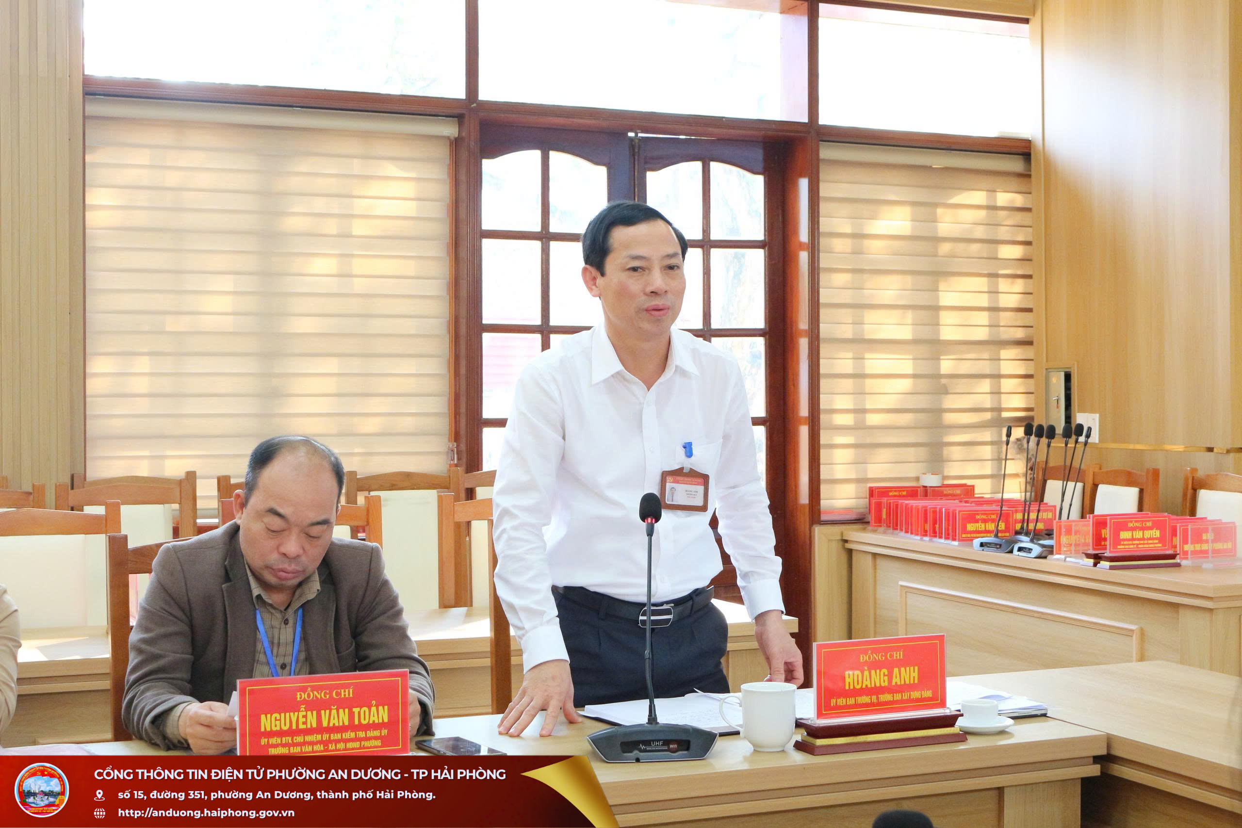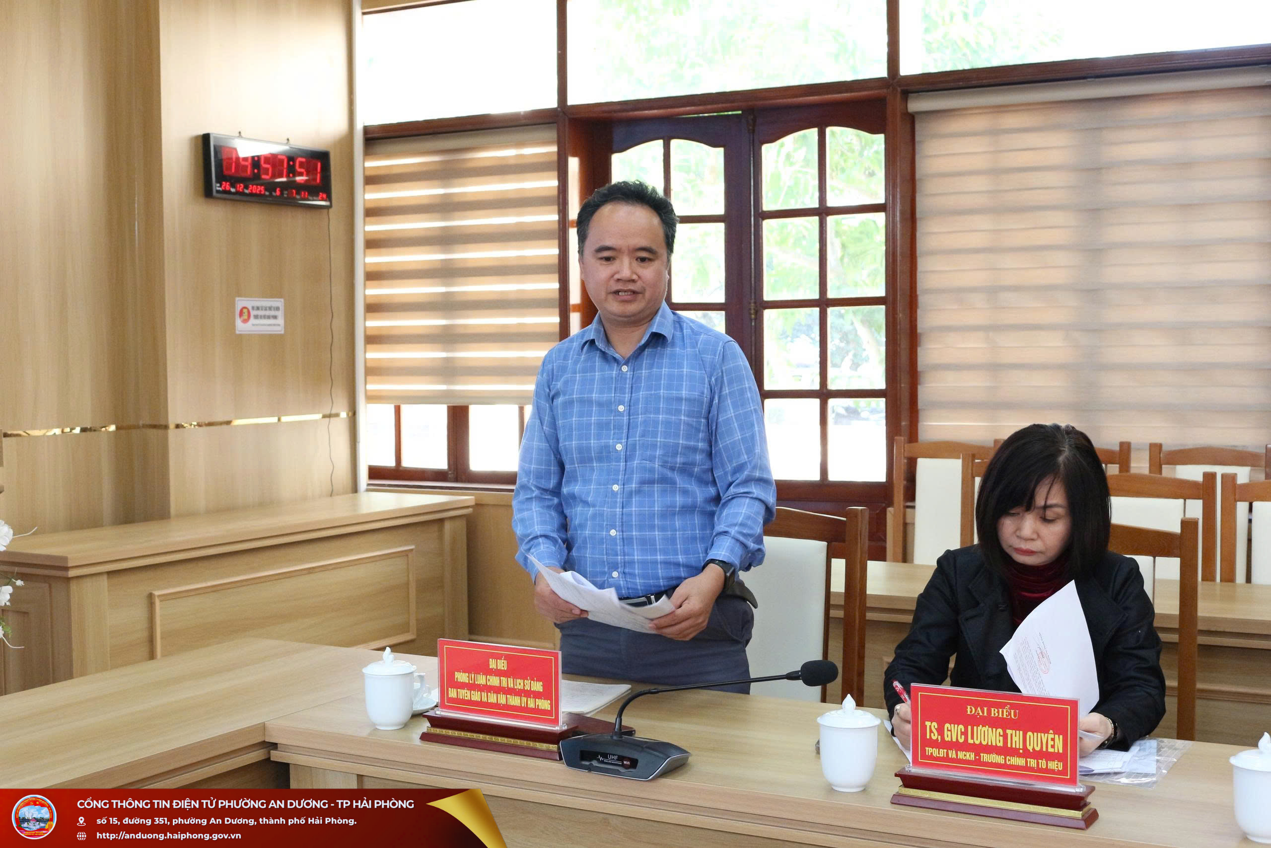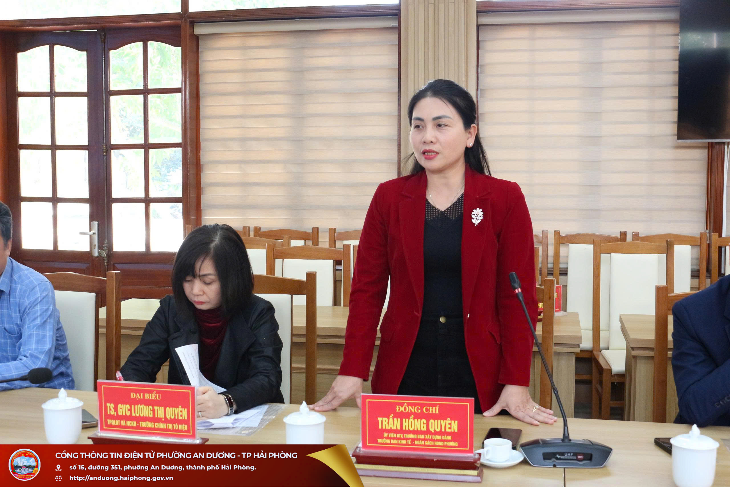 Quang cảnh hội nghịDự hội nghị có đại biểu Phòng Lý luận chính trị và Lịch sử Đảng - Ban Tuyên giáo và Dân vận Thành ủy Hải Phòng; đồng chí Lương Thị Quyên, Tiến sĩ, Giảng viên chính, Trưởng phòng Quản lý đào tạo và Nghiên cứu khoa học, Trường Chính trị Tô Hiệu; đồng chí Phạm Thị Kim Anh, Tiến sĩ, Giảng viên chính, Phó Trưởng phòng Quản lý đào tạo và Nghiên cứu khoa học, Trường Chính trị Tô Hiệu; lãnh đạo Ban Xây dựng Đảng, Ủy ban Kiểm tra Đảng ủy các phường An Dương, An Hải, An Phong; đại diện các cơ quan chuyên trách tham mưu, giúp việc Đảng ủy phường An Dương; cùng đội ngũ viên chức Trung tâm Chính trị phường An Dương.