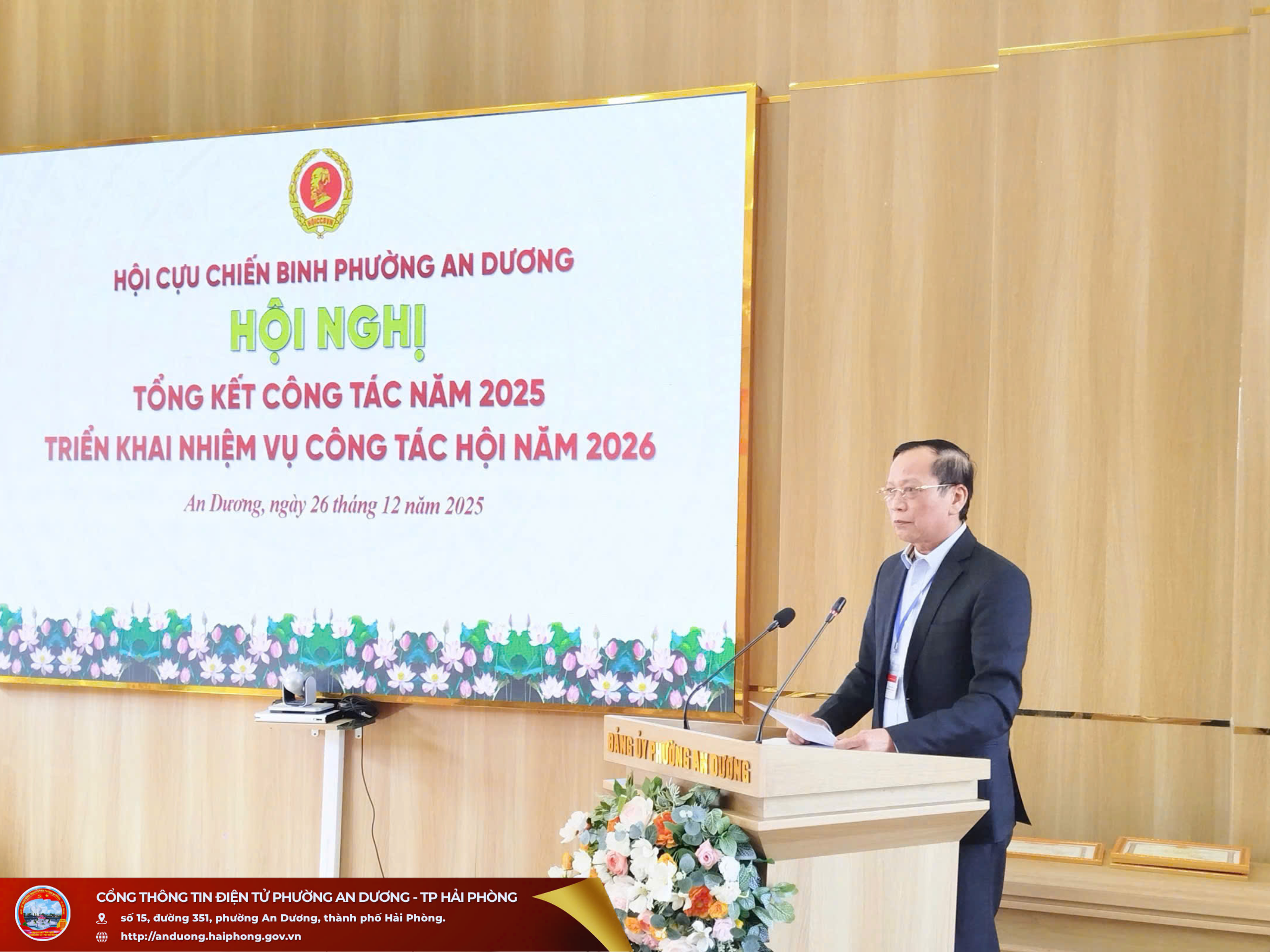 Đồng chí Vũ Đức Thụy - Phó bí thư thường trực Đảng ủy phường phát biểu tại hội nghịPhát biểu chỉ đạo tại Hội nghị đồng chí Vũ Đức Thụy - Phó bí thư thường trực Đảng ủy phường ghi nhận biểu dương những kết quả mà hội Cựu chiến binh phường đã đạt được trong năm qua; đồng thời trân trọng biểu dương sự đóng góp tích cực của cán bộ, hội viên cựu chiến binh trong xây dựng và phát triển kinh tế - xã hội, đảm bảo quốc phòng - an ninh của địa phương. Đồng chí tin tưởng rằng, cán bộ, hội viên cựu chiến binh tiếp tục phát huy truyền thống cách mạng, đoàn kết, gương mẫu và trách nhiệm, cùng Hội Cựu chiến binh phường sẽ hoàn thành xuất sắc các nhiệm vụ năm 2026, xứng đáng với niềm tin của Đảng bộ, chính quyền và Nhân dân./.