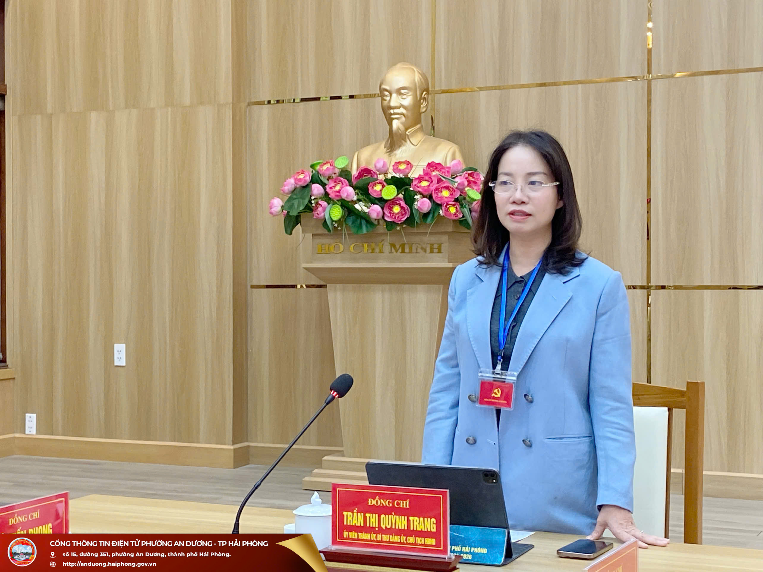 Chiều ngày 04/11, tại phòng họp Đảng ủy, Ban Chỉ đạo xây dựng phường An Dương trở thành “phường không ma túy” tổ chức Hội nghị đánh giá kết quả thực hiện nhiệm vụ trong thời gian qua. Đồng chí Trần Thị Quỳnh Trang - Ủy viên Thành ủy, Bí thư Đảng ủy, Chủ tịch HĐND phường, Trưởng Ban Chỉ đạo chủ trì Hội nghị.