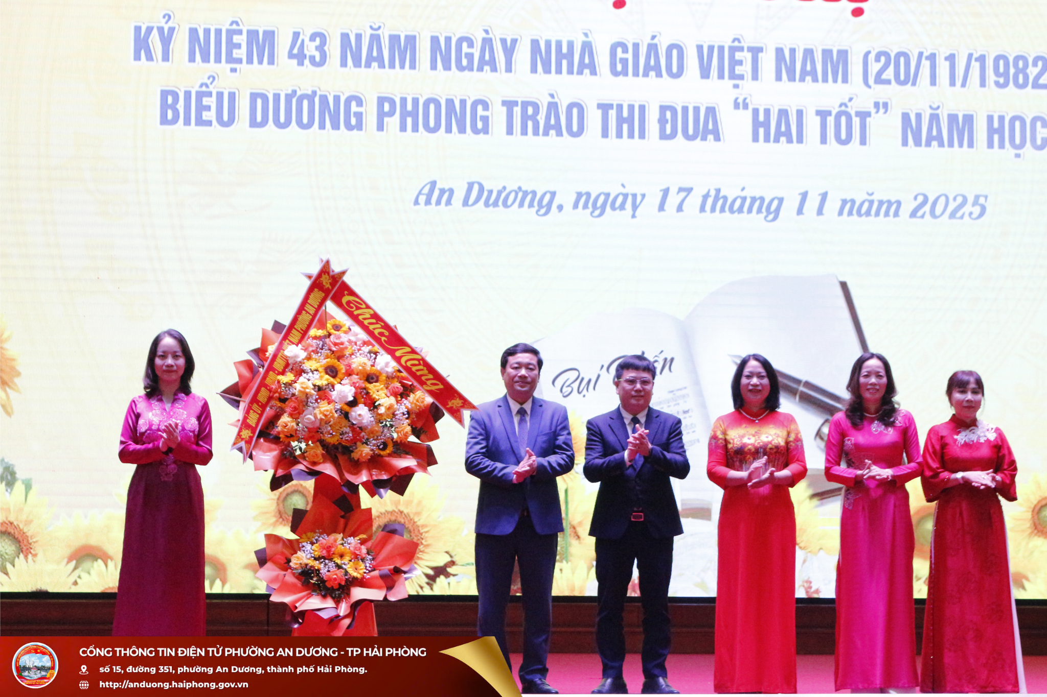 Đồng chí Vũ Trí Quang - Phó Giám đốc Sở Giáo dục và Đào tạo Hải Phòng lên tặng hoa chúc mừng ngành Giáo dục và Đào tạo phường An Dương.Sau sắp xếp đơn vị hành chính, quy mô, mạng lưới trường lớp phường An Dương ngày càng ổn định và phát triển đáp ứng với nhu cầu học tập của hơn 22.500 học sinh đang theo học tại 27 trường mầm non và phổ thông; 100% các trường mầm non, tiểu học, trung học cơ sở công lập đạt chuẩn quốc gia. Chuẩn bị cho năm học mới, trên địa bàn phường có 09 dự án xây mới phòng học, phòng chức năng hoàn thành đưa vào khai thác sử dựng với tổng vốn đầu tư 120 tỷ đồng; trước thềm năm học mới 2025-2026 khởi công mới 04 dự án với tổng vốn đầu tư gần 100 tỷ đồng. Giáo dục An Dương trở thành điểm sáng với nhiều bước tiến mới trong thực hiện chuyển đổi số. Trí tuệ nhân tạo (AI) đã được ứng dụng trong giảng dạy - từ việc chấm bài, theo dõi tiến độ học tập, phân tích năng lực cá nhân đến đề xuất lộ trình học tập phù hợp.