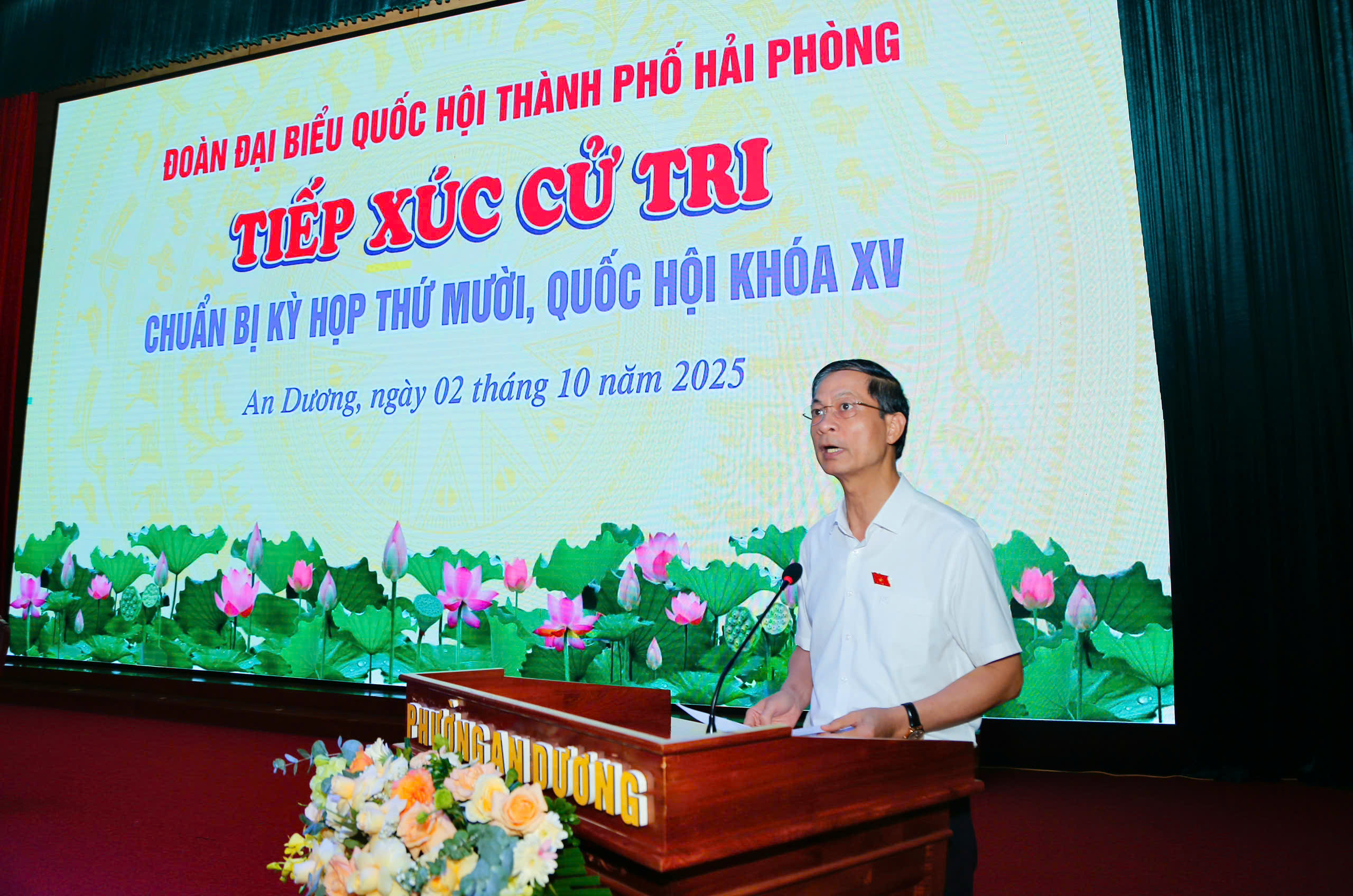 Sáng 2/10, tại Nhà văn hóa phường An Dương, Đoàn đại biểu Quốc hội (ĐBQH) thành phố Hải Phòng gồm các đồng chí: Nguyễn Minh Quang - Phó Chánh Thanh tra Bộ Quốc phòng; Tống Văn Băng - Ủy viên Đoàn Chủ tịch, Trưởng Ban Quan hệ lao động Tổng Liên đoàn Lao động Việt Nam; Đỗ Mạnh Hiến - Phó Bí thư Thường trực Thành ủy đã có buổi tiếp xúc cử tri các phường An Dương, An Hải và An Phong, chuẩn bị cho kỳ họp thứ 10, Quốc hội khóa XV.