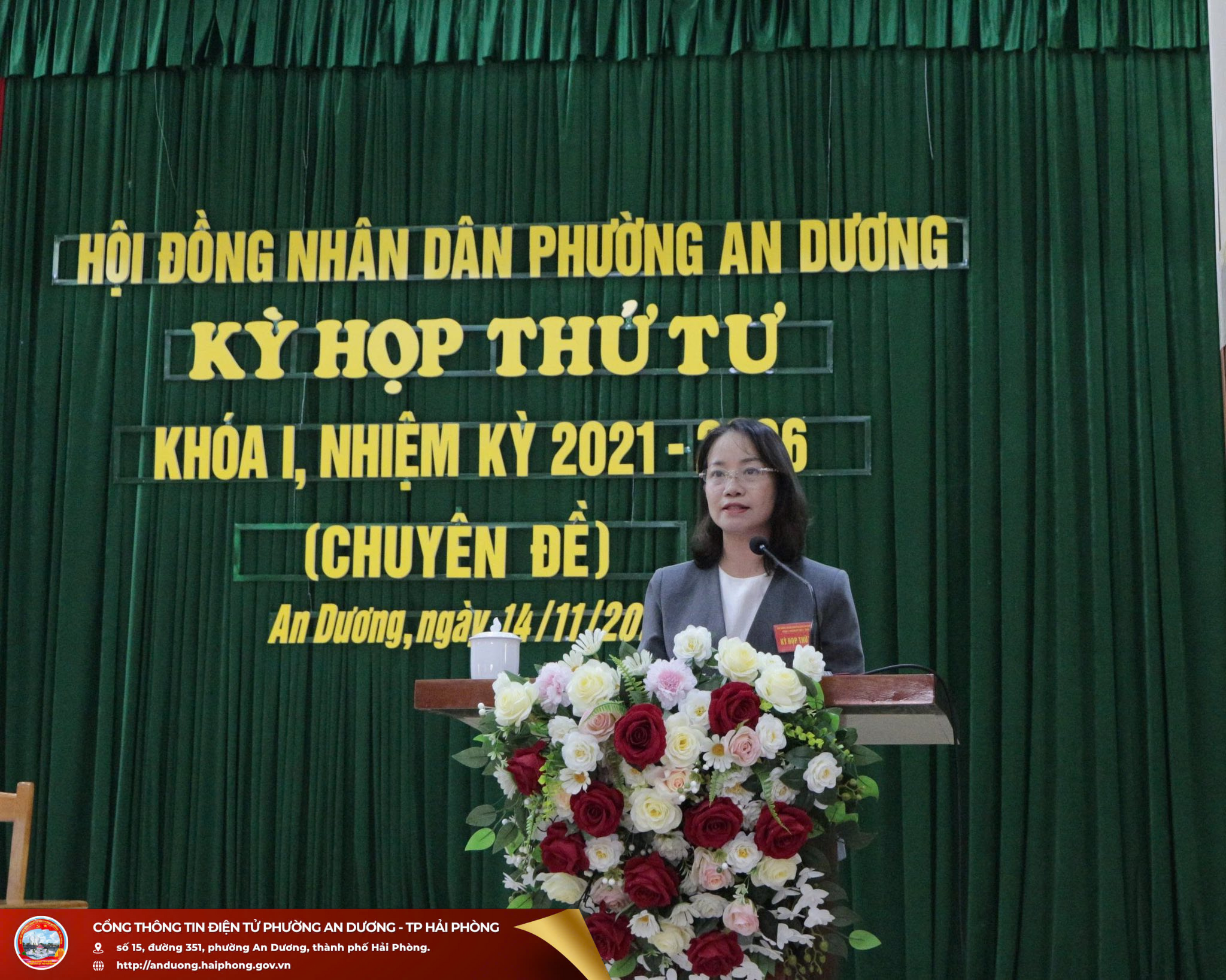 Đồng chí Trần Thị Quỳnh Trang - Bí thư Đảng ủy, Chủ tịch HĐND phường phát biểu tại kỳ họp chuyên đềPhát biểu bế mạc kỳ họp, đồng chí Trần Thị Quỳnh Trang - Bí thư Đảng ủy, Chủ tịch HĐND phường ghi nhận tinh thần làm việc nghiêm túc, trách nhiệm của các đại biểu; đồng thời đề nghị UBND phường, các cơ quan, ban ngành và đại biểu HĐND phường sớm tổ chức triển khai các nghị quyết đã được thông qua; tăng cường giám sát, bảo đảm tính công khai, minh bạch và hiệu quả trong quá trình thực hiện. Đồng chí nhấn mạnh: năm 2025 đặt ra nhiều nhiệm vụ quan trọng, đòi hỏi toàn hệ thống chính trị và Nhân dân phường An Dương tiếp tục đoàn kết, nỗ lực phấn đấu hoàn thành thắng lợi các mục tiêu đã đề ra, góp phần xây dựng phường ngày càng phát triển.