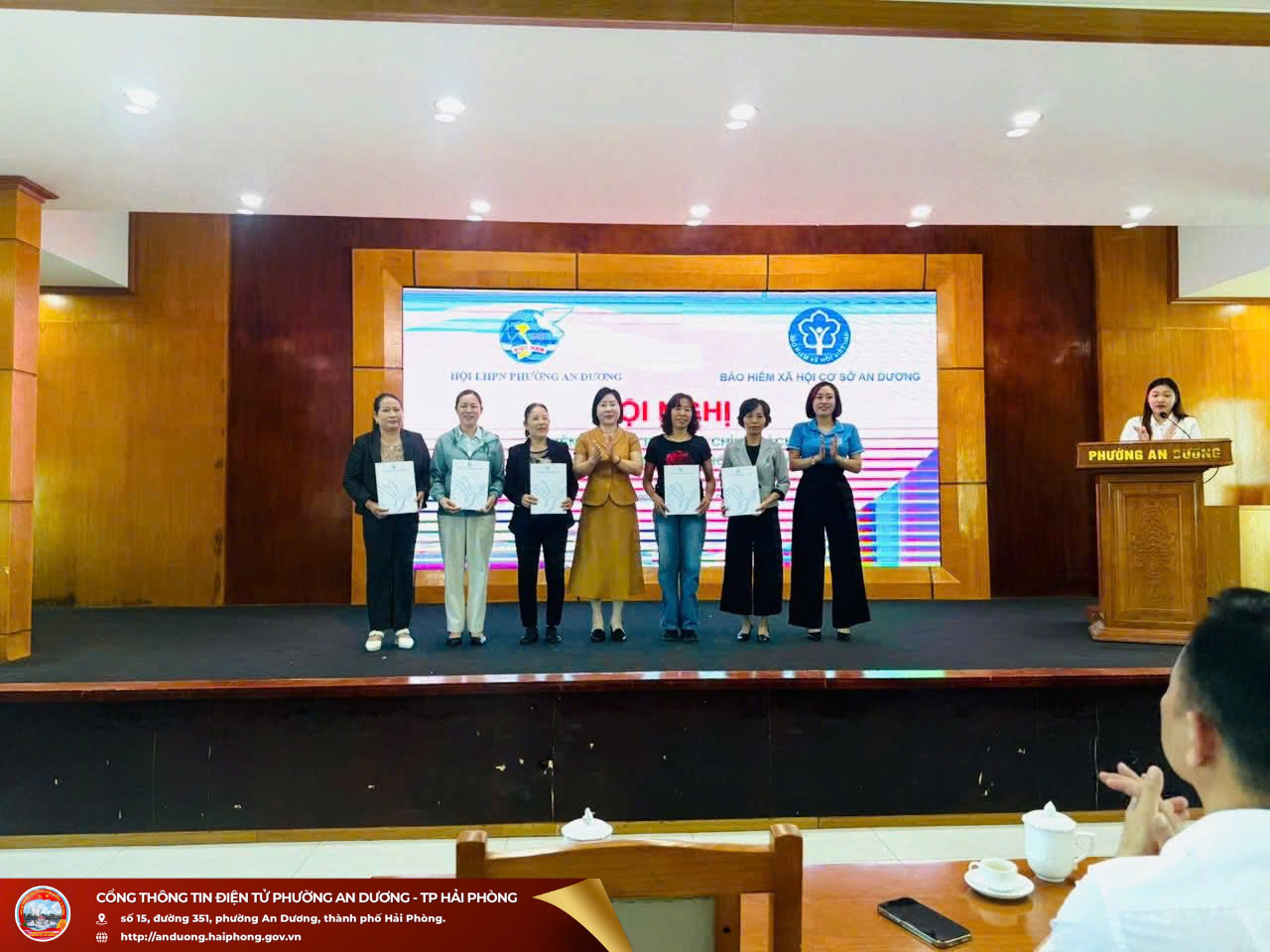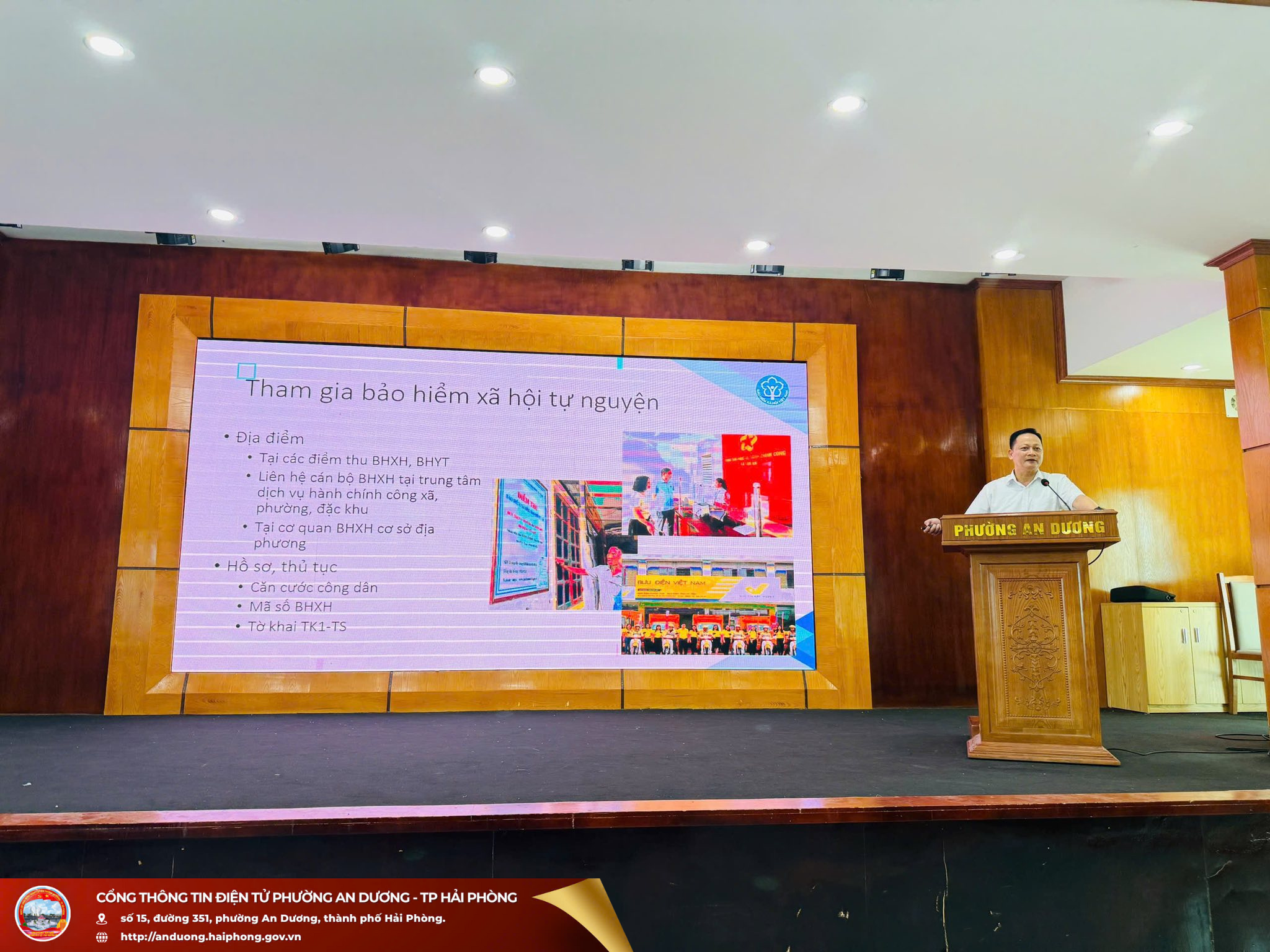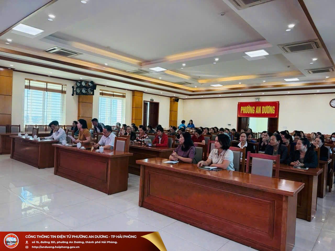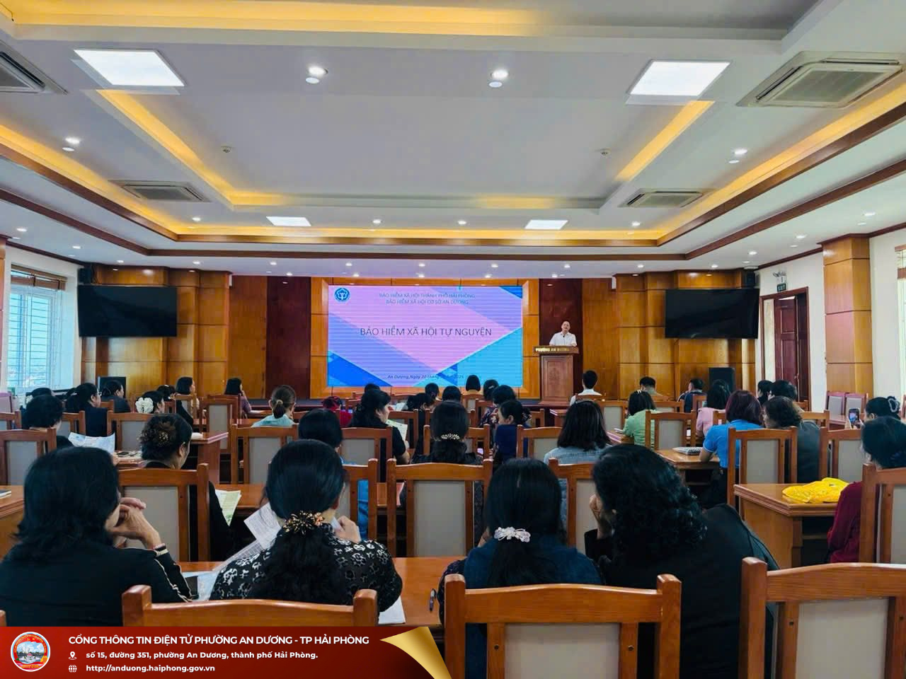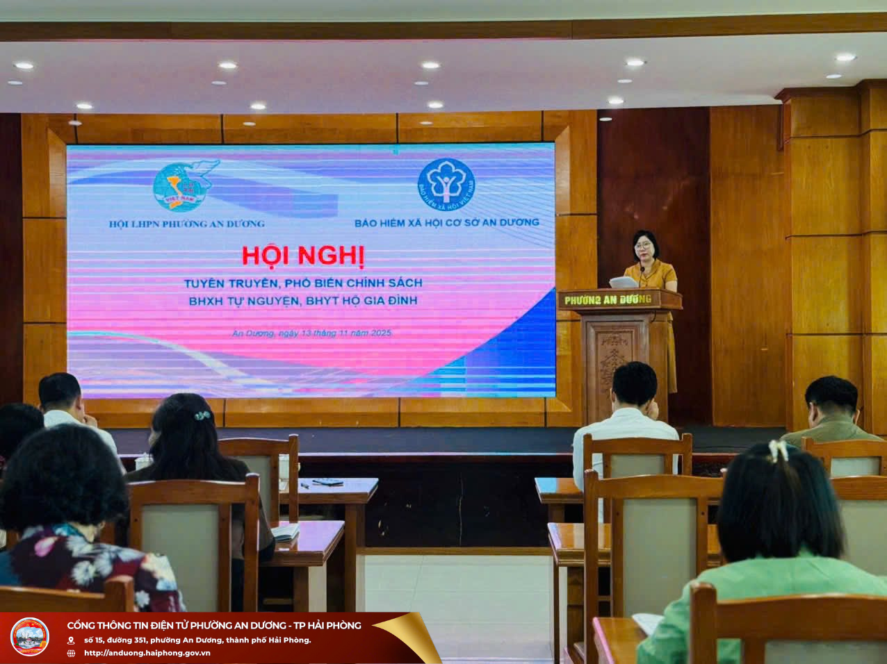 Quang cảnh Hội nghịDự hội nghị có các đồng chí đại diện Ủy ban MTTQ Việt Nam phường, các ban, ngành, đoàn thể phường cùng đại diện BHXH cơ sở An Dương. Ông Nguyễn Văn Triển - Giám đốc BHXH cơ sở An Dương tham dự và trực tiếp làm báo cáo viên, truyền đạt những nội dung cơ bản về chính sách BHXH tự nguyện, BHYT hộ gia đình, đồng thời phân tích rõ những chính sách hỗ trợ của Nhà nước đối với người tham gia, giải đáp những thắc mắc của cán bộ, hội viên phụ nữ. Qua đó, giúp hội viên hiểu rõ hơn ý nghĩa, lợi ích của việc tham gia BHXH, BHYT trong bảo đảm an sinh xã hội, ổn định đời sống và chăm lo sức khỏe lâu dài cho bản thân và gia đình.