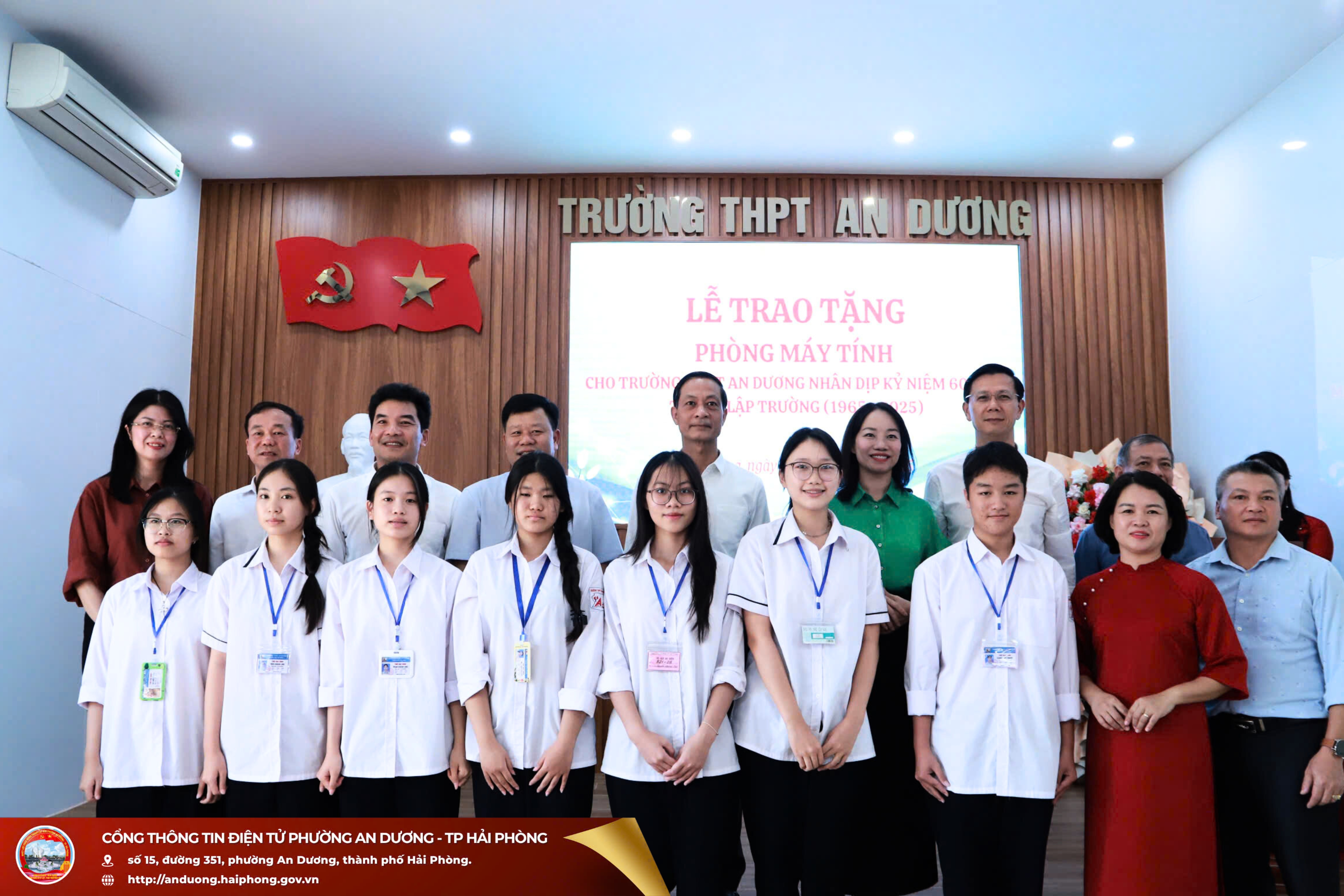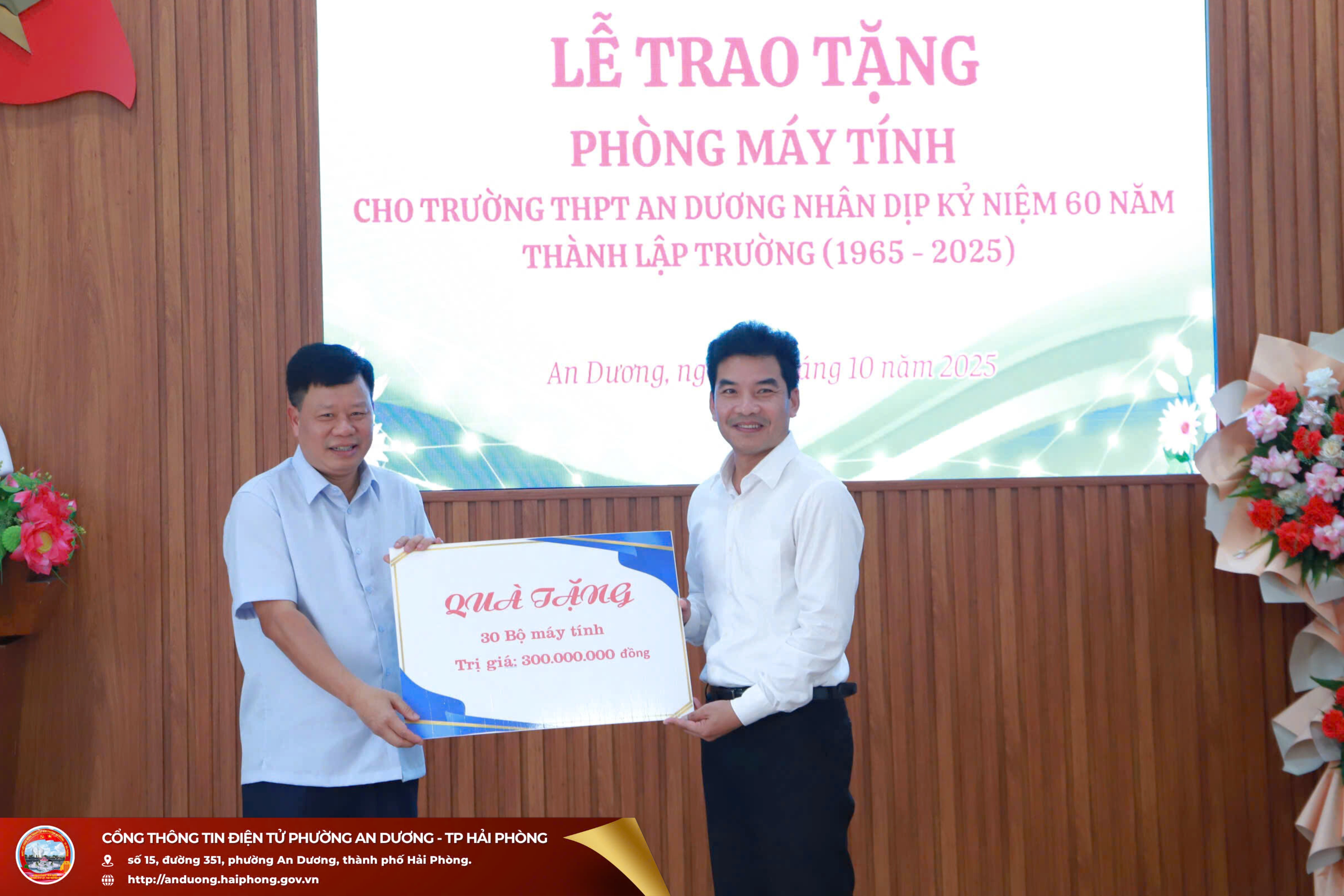Nhân dịp kỷ niệm 60 năm thành lập trường Trung học phổ thông An Dương, chiều ngày 16/10, diễn ra Lễ trao tặng phòng máy tính do đồng chí Đỗ Mạnh Hiến, Phó Bí thư thường trực Thành ủy Hải Phòng, cựu học sinh trường Trung học phổ thông An Dương khóa 1983 - 1986 và đồng chí Lê Trung Kiên, Ủy viên Ban thường vụ Thành ủy, Trưởng ban Ban Quản lý Khu kinh tế Hải Phòng, cựu học sinh khóa 1988 - 1999 trao tặng. Dự và chúc mừng buổi trao tặng phòng máy tính, lãnh đạo phường An Dương có các đồng chí: Trần Thị Quỳnh Trang, Ủy viên Thành ủy, Bí thư Đảng ủy, Chủ tịch Hội đồng nhân dân phường; đồng chí Bùi Tiến Phong, Phó Bí thư Đảng ủy, Chủ tịch UBND phường.